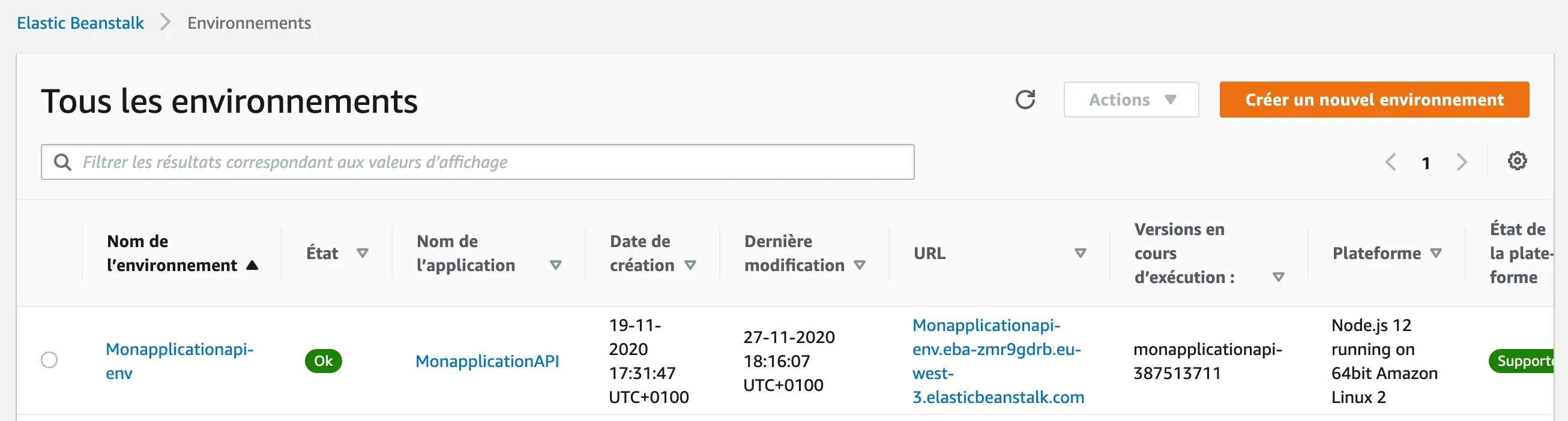 Si vous avez des variables d'environnement à exposer à votre back-end, vous pouvez les ajouter depuis l'interface de l'environnement de votre application Beanstalk. Pour ce faire, rendez-vous dans le service "Elastic Beanstalk" et sélectionner votre environnement (dans ce tutoriel "Monapplicationapi-env") :