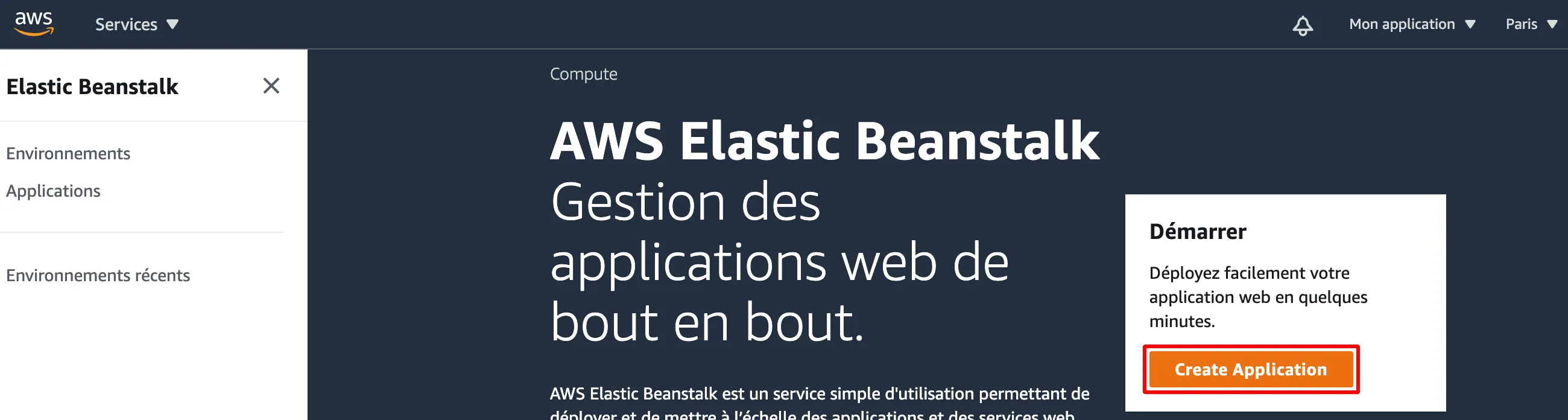 Rendez-vous sur le service "Elastic Beanstalk" de la console AWS. Veillez à bien sélectionner dans le menu déroulant en haut à droite la région dans laquelle vous souhaitez mettre en ligne votre application. Créez ensuite votre application.