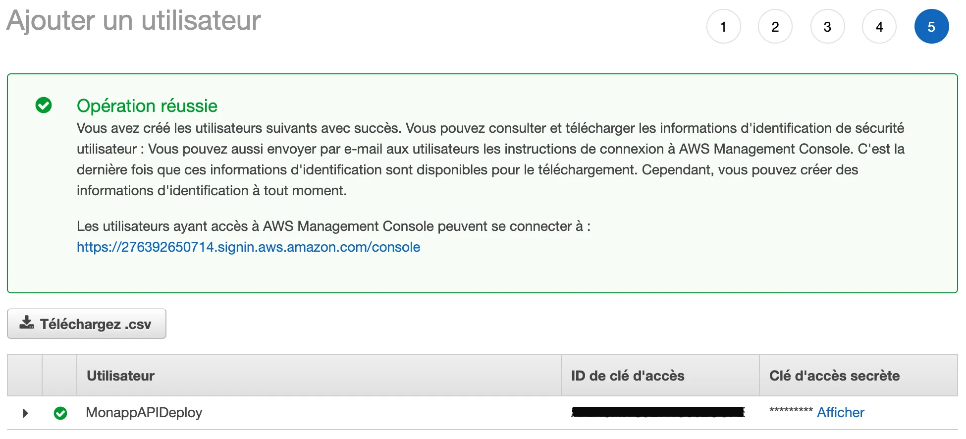 Notez bien votre ID de clé d'accès "AWS_ACCESS_KEY_ID" et votre clé d'accès secrète "AWS_SECRET_ACCESS_KEY". Nous allons les utiliser juste après pour mettre en place le déploiement sur Github.