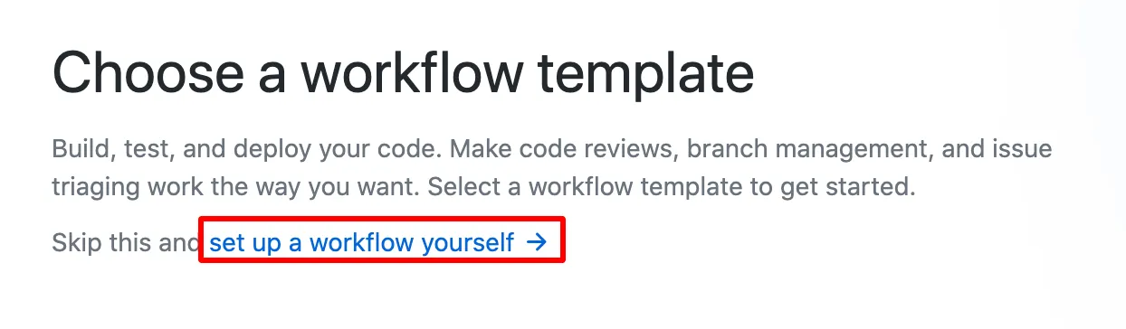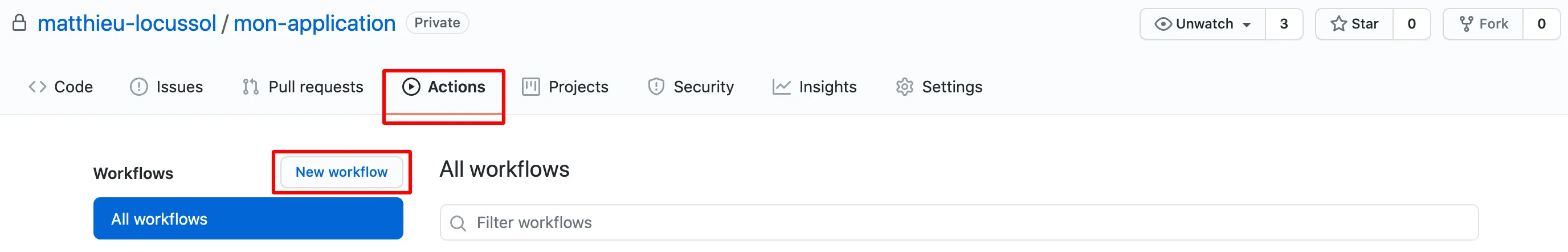 Rendez-vous sur votre repository Github, dans la section "Actions". Nous allons créer un nouveau workflow en cliquant sur le bouton "New workflow" en haut à gauche. Mettez en place un nouveau workflow manuellement :
