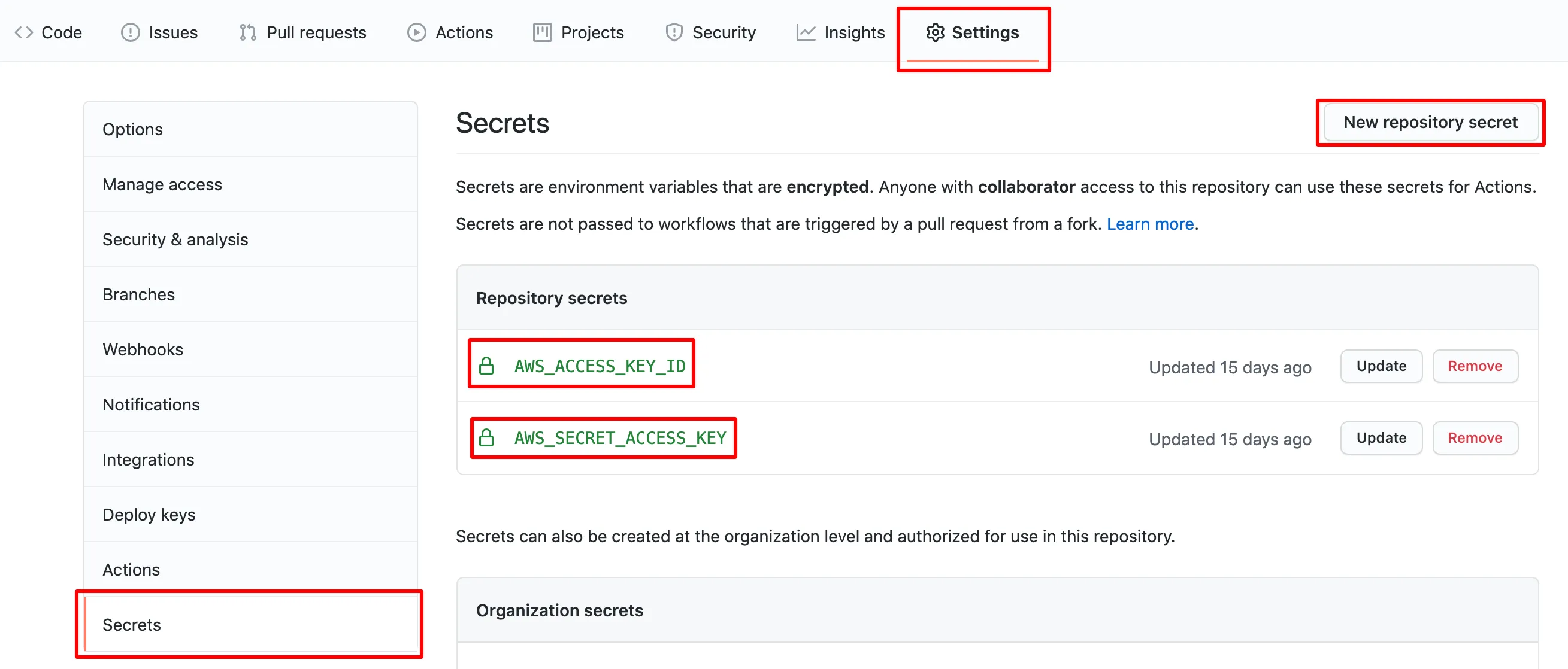 Il va ensuite falloir renseigner les deux clés AWS que nous avons créées précédemment dans le service IAM. Rendez-vous sur votre repository Github, dans la rubrique "Settings > Secrets". Ajoutez donc les deux clés créées :